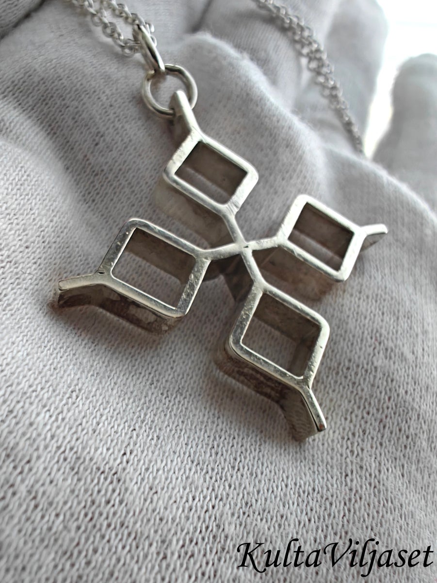 Jorma Laineen suunnittelman Ruutu-sarjan riipuskoru, korun koko 3,6 x 3,8cm ja ketjun pituus 80cm, valmistettu 70-luvulla Turun Kultateollisuudessa