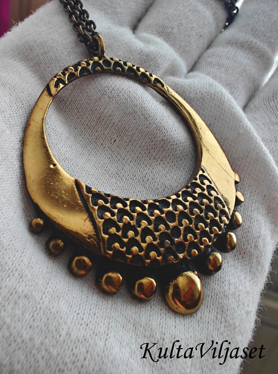 Pronssiriipus, jonka koruosan koko 4,5 x 5,2cm ja ketjun pituus 60cm, valmistettu Turun Hopeassa 60/70-luvulla.