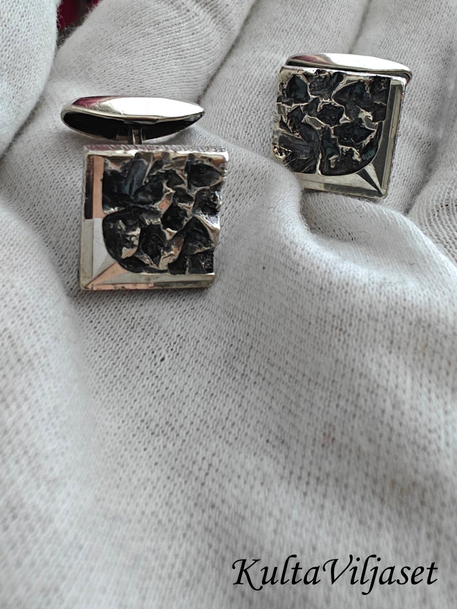 Hopeiset korvakorut tummennettua hopeaa, koruosan koko 1,5x1,5cm, valmistettu Heinolassa vuonna -70