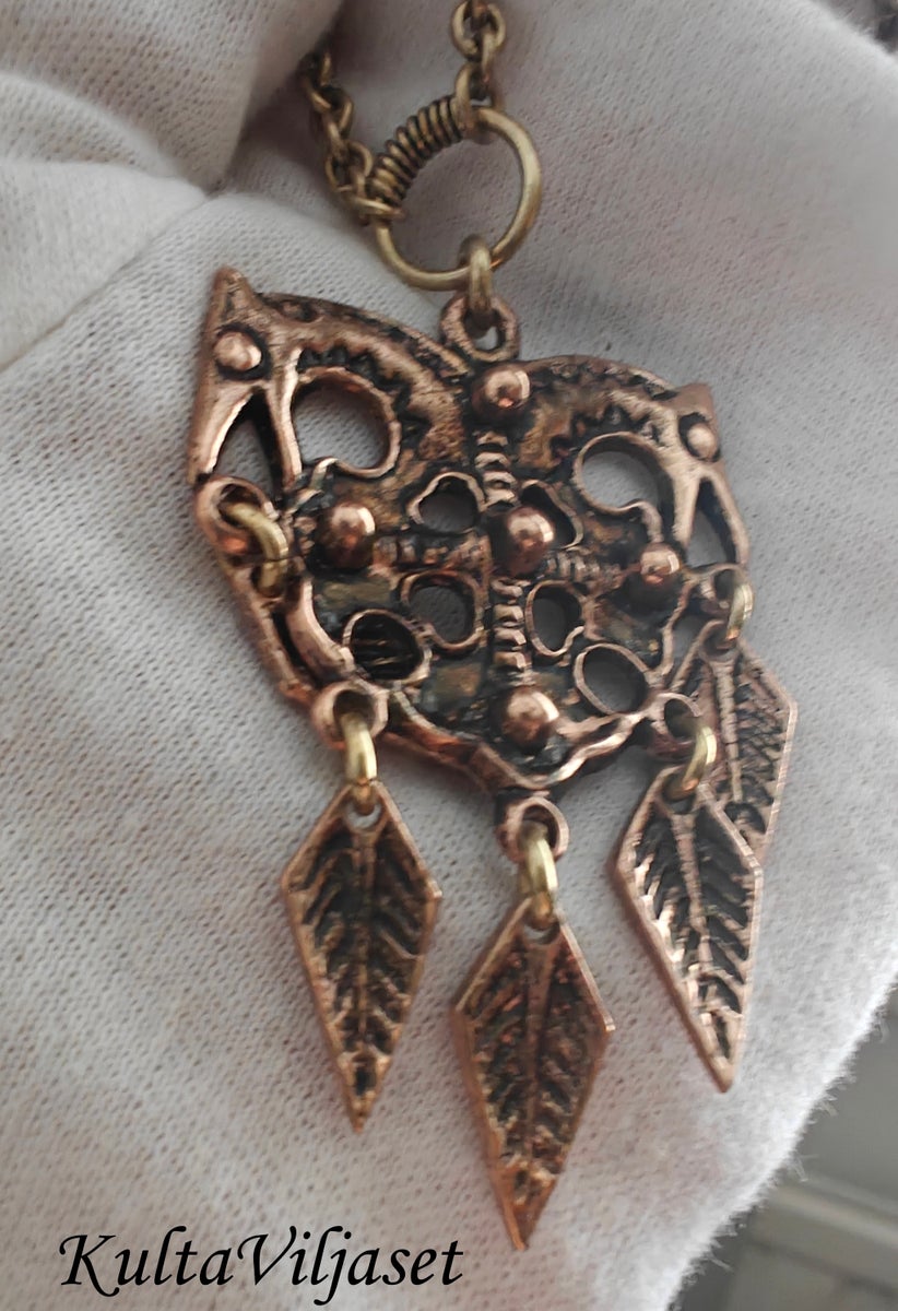 Pronssinen Germund Paaerin suunnittelema riipuskoru, korun korkeus 7cm ja ketjun pituus 80cm, valmistettu Kalevala Korulla Helsingissä