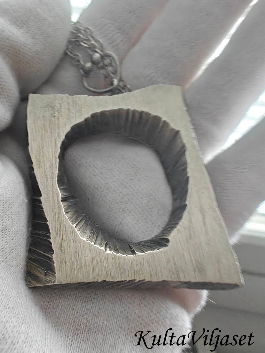 Rohkeaa brutalistista muotoilua 70-luvulta! Hopeisen riipuksen koko 5,4x4,5cm ja ketjun pituus 70cm, valmistettu Finnfeelingsillä Turussa vuonna -74