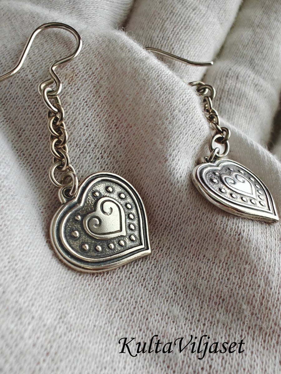 Hopeiset Euran Sydän korvakorut, sydänhelan koko 1,5x1,5cm ja korvakorun korkeus 4,5cm, koukkukiinnitys, valmistettu Kalevala Korulla Helsingissä