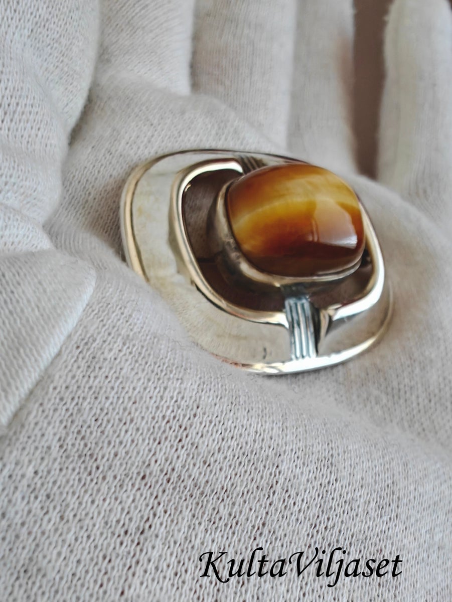 Hopeinen solki tiikerinsilmällä, korun koko 3,9x3,2cm, valmistettu Helsingissä vuonna -64