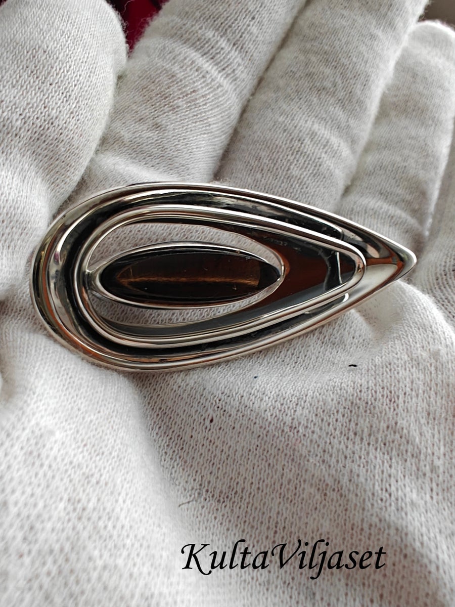 Erik Granitin näyttävää muotoilua vuodelta 1966, hopenen solki savukvartsikivellä, soljen koko 5,2x2,2cm.